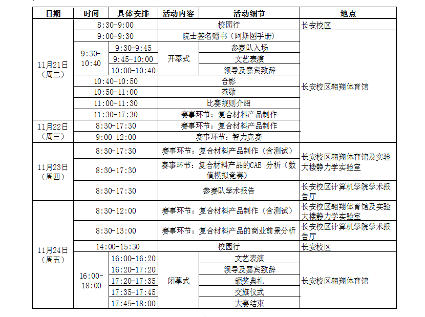 第二届复合材料世界杯赛(Composite Battle World Cup,Xi’an 2017)将于2017年11月20日至11月24日在西北工业大学长安校区举办。主办方是“一带一路”航天创新联盟(常设秘书处单位是西北工业大学)和中俄工科大学联盟(西北工业大学是今年的中方轮值主席单位)。承办方是西北工业大学。