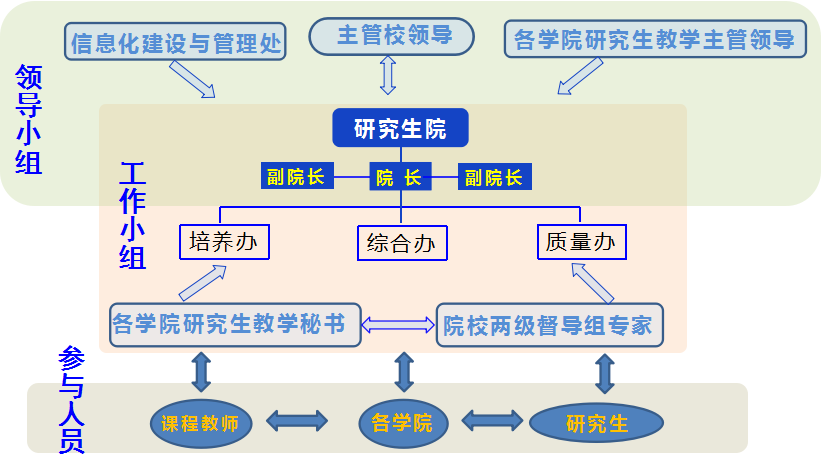 成 员:研究生院培养办,研究生院质量办,各教学单位研究生教学秘书,院校两级督导组专家