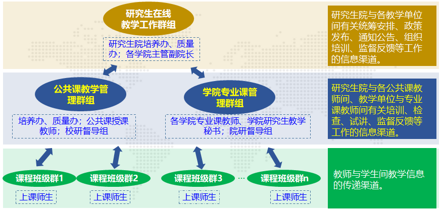 1.研究生在线教学工作群组:由研究生院培养办、质量办负责人,各教学单位研究生教学秘书组成。目的是建立研究生院与各教学单位间有关政策发布、通知公告、监督反馈等工作的信息渠道。
