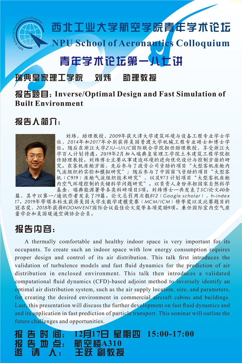 【学术报告】航空学院青年学术论坛187讲——瑞典皇家理工学院 刘炜 助理教授