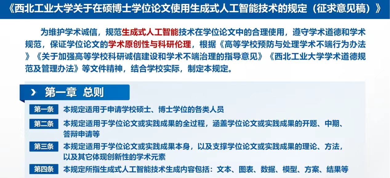 研究生院介绍了《西北工业大学关于在硕博士学位论文使用生成式人工智能技术的规定》(征求意见稿)。该文件明确了生成式人工智能技术的使用规范与边界、标注与声明要求、检测与审核流程、违规处理办法等。
