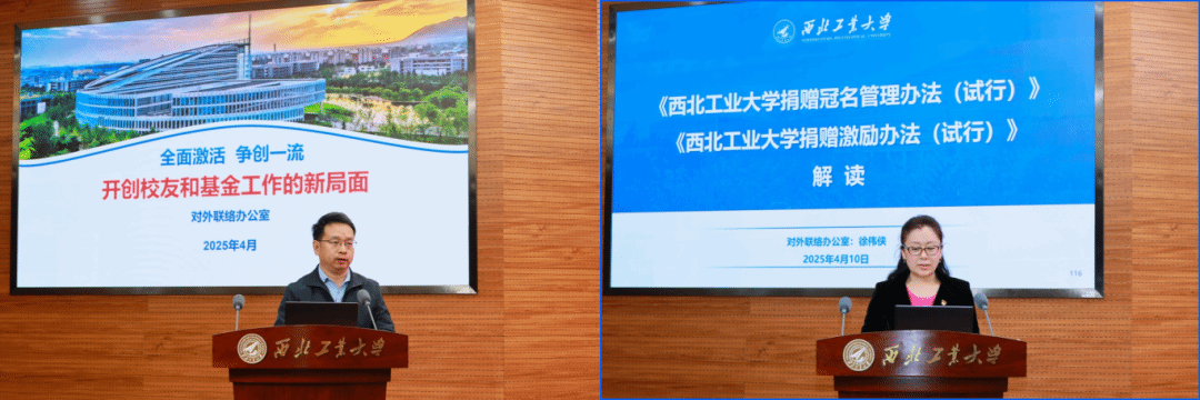 对外联络办公室主任杨铭整体介绍了学校校友和基金工作概况,梳理了当前存在的主要问题,提出下一步的工作思路和举措。为激励推动相关工作落实,学校出台了《西北工业大学捐赠冠名管理办法(试行)》《西北工业大学捐赠激励办法(试行)》,对外联络办公室副主任徐伟侠对文件内容进行了解读说明。
