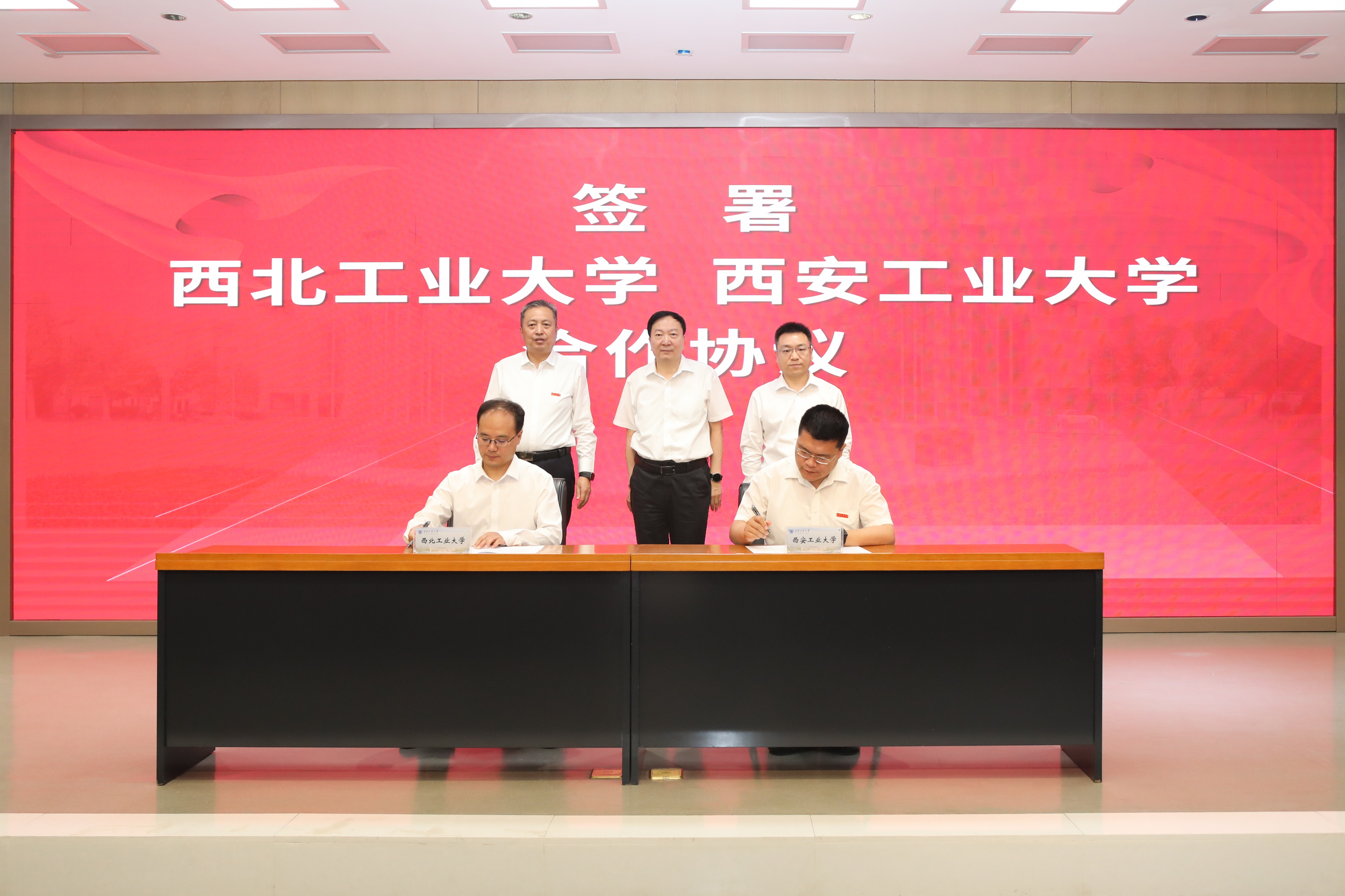 鸭脖官网副校长王伶与西安工业大学校长姚尧签署合作协议。李言荣,何玉麒,侯成义共同见签。