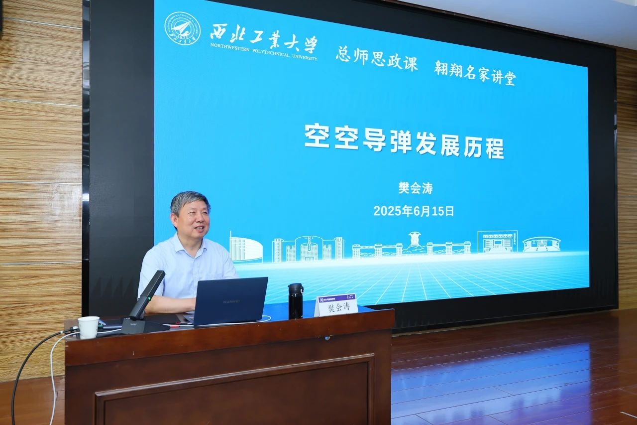 6月15日下午,中国工程院院士、我国空空导弹领域权威专家樊会涛重返母校西北工业大学,做客翱翔名家讲堂,讲授总师思政课,为师生带来题为《空空导弹发展历程》的专题报告。副校长岳晓奎参加活动。航天学院、动力与能源学院、党委宣传部师生代表200余人现场聆听了樊会涛院士的精彩授课。报告会由航天学院党委书记黄越主持。