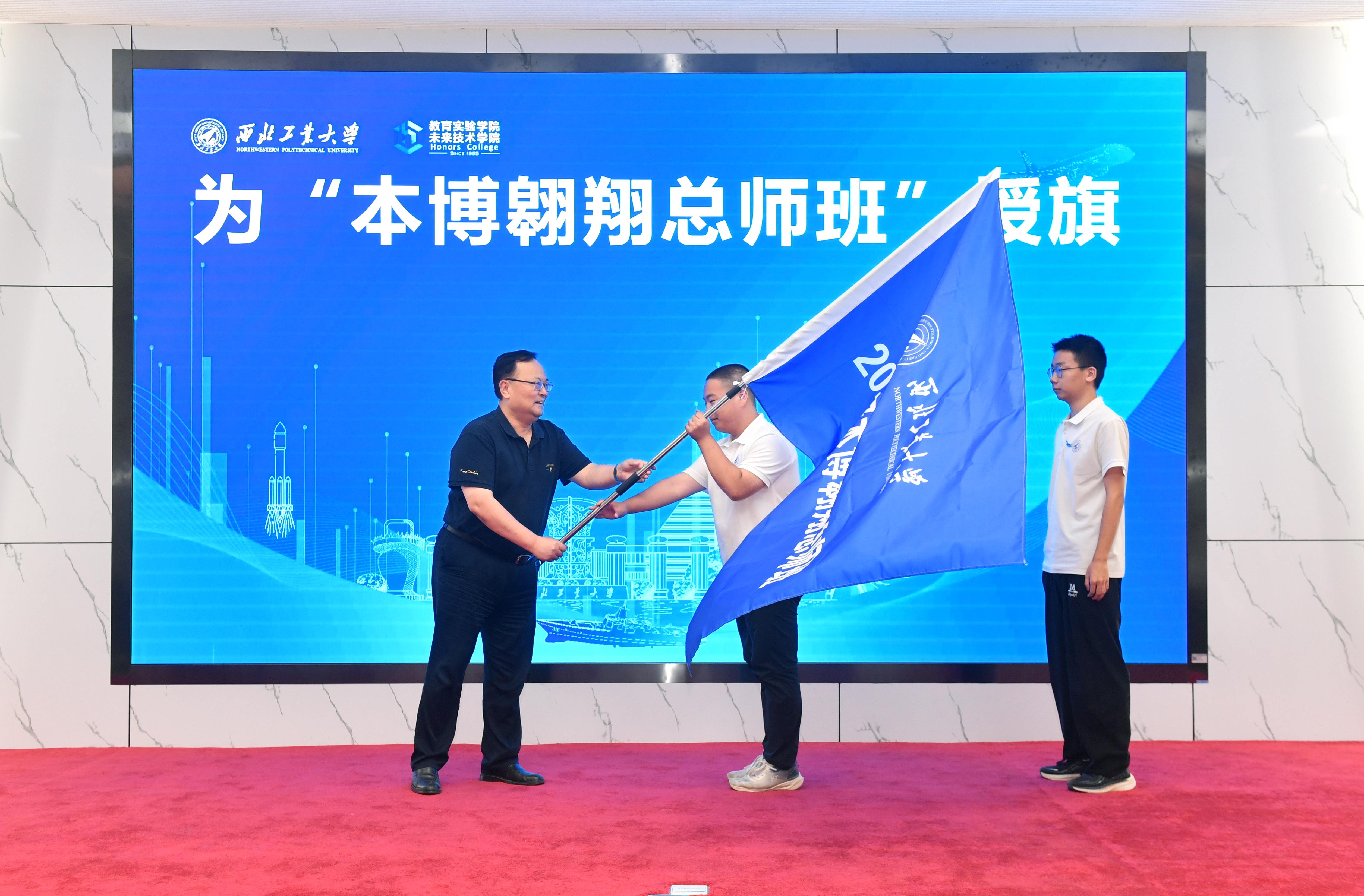 宋保维为“本博翱翔总师班”授旗。