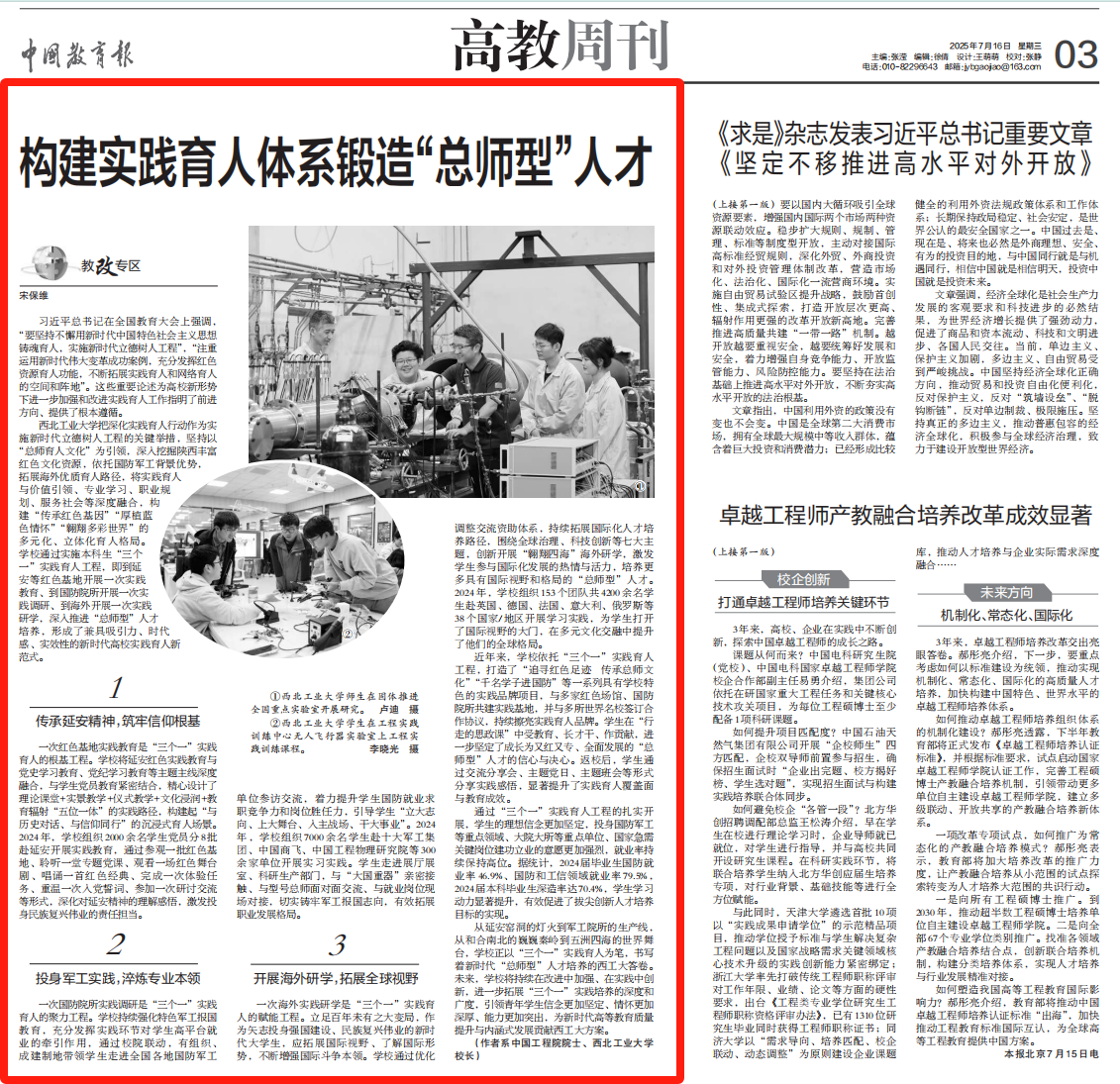 7月16日,《中国教育报》刊发鸭脖官网校长宋保维署名文章《构建实践育人体系锻造“总师型”人才》。文章阐述了鸭脖官网“三个一”实践育人工程的特色做法和显著成效。全文如下。