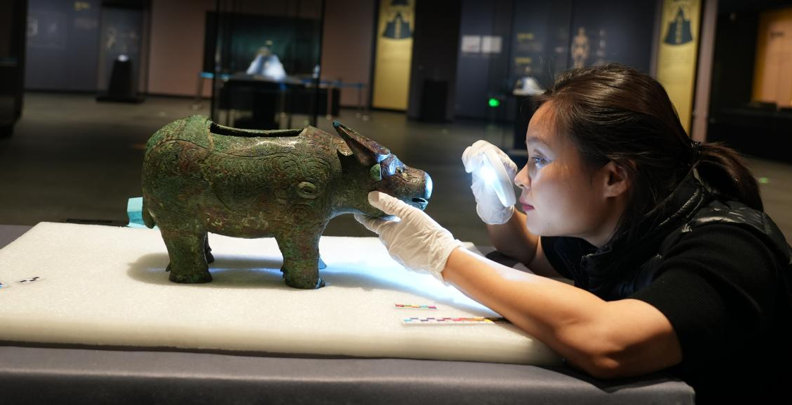 杨欢副教授对亚长牛尊的工艺细节进行观察