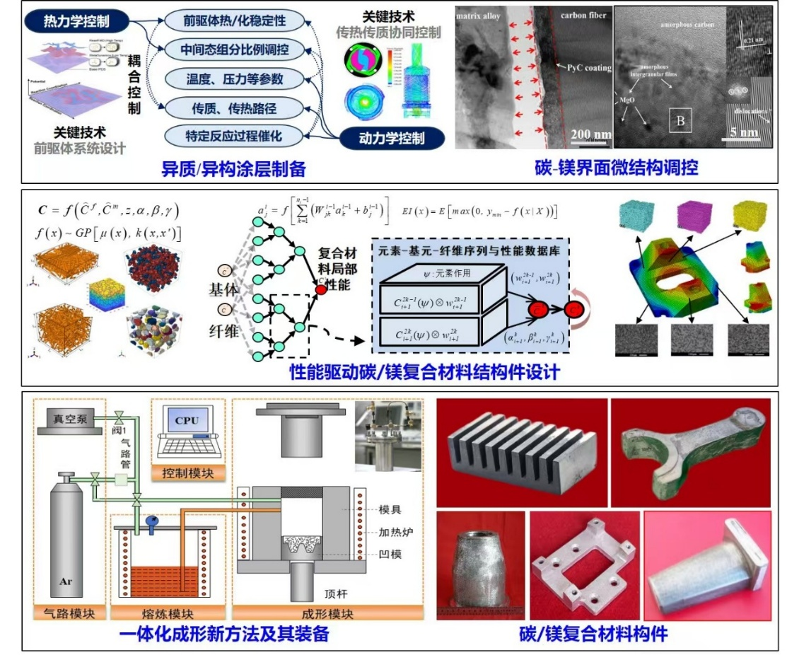 项目介绍:该成果针对航空航天及民用领域对轻质高性能复合材料的重大需求,提出了碳/镁复合材料设计与制备一体化新思路。揭示了碳纤维预制体异质/异构涂层构筑与形性调控机理,创立发展了系列涂层体系,提出碳-镁复合界面构筑与精细调控策略,解决了碳/镁高温复合与界面调控难题;构建了碳/镁复材工艺-结构-性能映射关系,发展了性能驱动的碳/镁复材整体-局部结构设计方法,发明了真空吸渗挤压定域增强镁基复合材料新技术和关键装备,实现镁基复合材料构件一体化近净成形,解决了高性能碳/镁复合材料设计制造的瓶颈问题,在航天、兵器、民用领域得到应用。