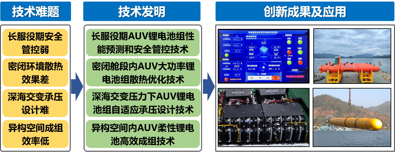 项目介绍:该成果针对水下航行器锂电池组面临的高效安全使用难题,突破了长服役期水下航行器锂电池组性能预测和安全管控技术、密闭舱段内水下航行器大功率锂电池组散热优化技术、深海交变压力下水下航行器锂电池组自适应承压设计技术、异构空间内水下航行器柔性锂电池高效成组技术,完成了多型水下航行器锂电池组的湖海试验和技术应用,形成了锂电池在水下航行器领域的设计应用能力,为水下装备向全电动化推进奠定了坚实的理论基础和技术支撑。成果还在电动汽车锂电池组、储能电源等产品中得到推广应用,产生了重大社会经济效益。
