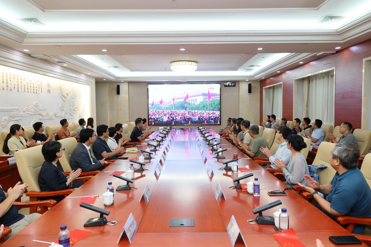全体校领导,机关干部和师生代表在友谊校区会议中心集体收看