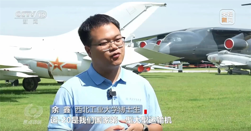 西北工业大学博士生余鑫:“运-20是我们国家第一型大型运输机,展现了我国在大国重器方面从无到有的力量。作为一名材料学的博士生,不仅让我了解到一件件展品背后的故事,更让我看到一架架飞机背后材料在军工领域运用的卓越性。”
