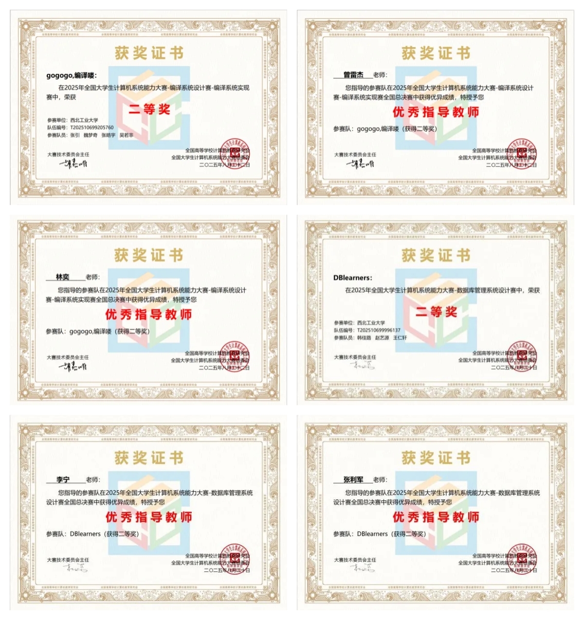 在编译系统设计赛中,由曾雷杰、林奕老师指导的“gogogo, 编译喽”队(张引、魏梦奇、张皓宇、吴若非),实现从SysY2022到ARMv8汇编的编译系统,完成多项优化,依托学校自研评测平台NPUCOJ,从151支队伍中脱颖而出,获全国二等奖。