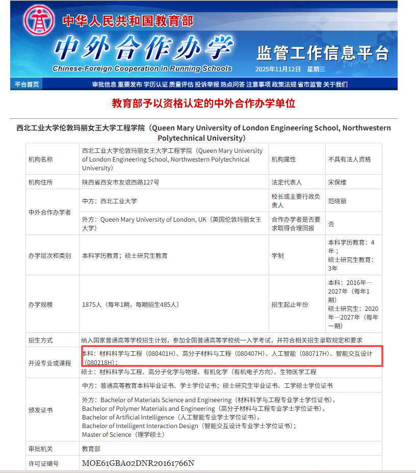 近日,西北工业大学伦敦玛丽女王大学工程学院(以下简称“学院”)增设“人工智能”(080717H)、“智能交互设计”(080218H)两个本科专业正式获得教育部批复同意。这是学院贯彻落实学校第十四次党代会精神,紧密围绕学校“127”目标和“一十百千”中期目标,在中外合作办学领域取得的一项重要进展。新专业的获批,标志着学校在深化教育对外开放、优化学科专业结构方面取得新的突破。