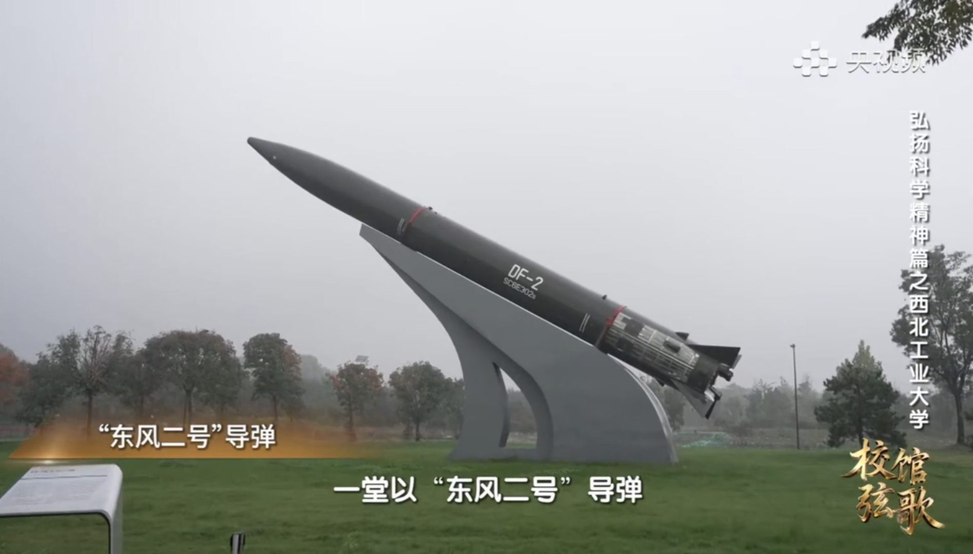西北工业大学航天学院教授王焘:“这个导弹上面这个叫‘蒙皮’,飞机也有蒙皮。你们要是将来学飞机、学导弹(它们都是)有蒙皮的。蒙皮下面是骨架,看见没有?这个导弹的长度是21米。‘东风一号’是17.7米,我们是在‘东风一号’的基础上搞的这一枚导弹。”