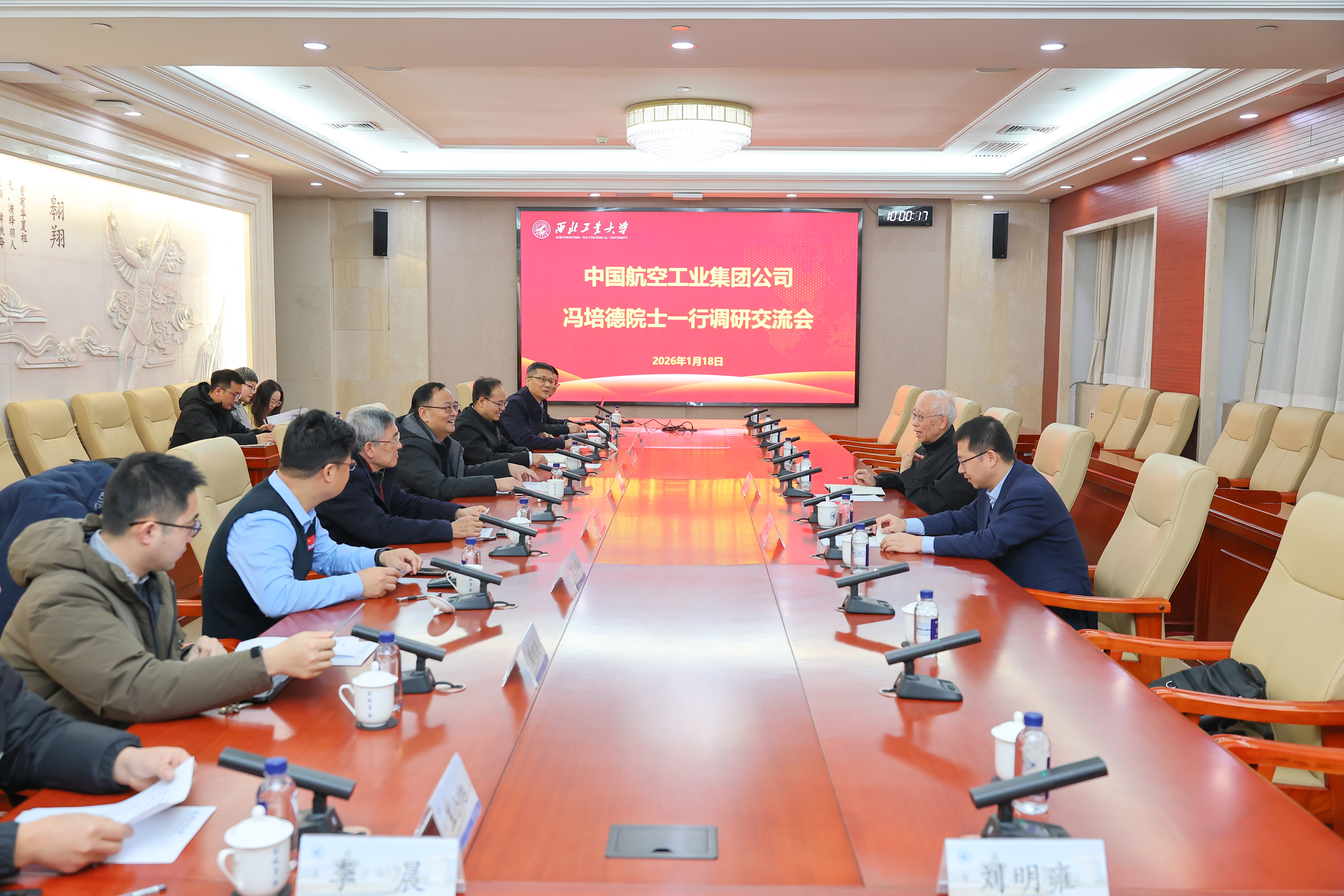 1月18日,中国航空工业集团公司冯培德院士一行来校调研。校长宋保维与冯培德一行进行会谈。副校长王伶陪同调研并参加座谈交流。座谈会由科学技术研究院院长常洪龙主持。