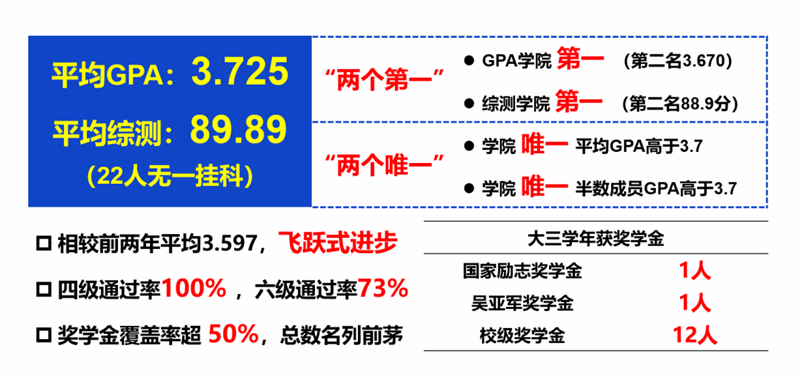 班级以平均GPA 3.725、平均综测89.89、无一人挂科的成绩,包揽学院“两个第一”“两个唯一”(具体内容见下图),同时奖学金覆盖率超过了50%,同学们的成绩相较大类培养阶段都取得了显著的提高,真正实现了全班同学的共同进步。