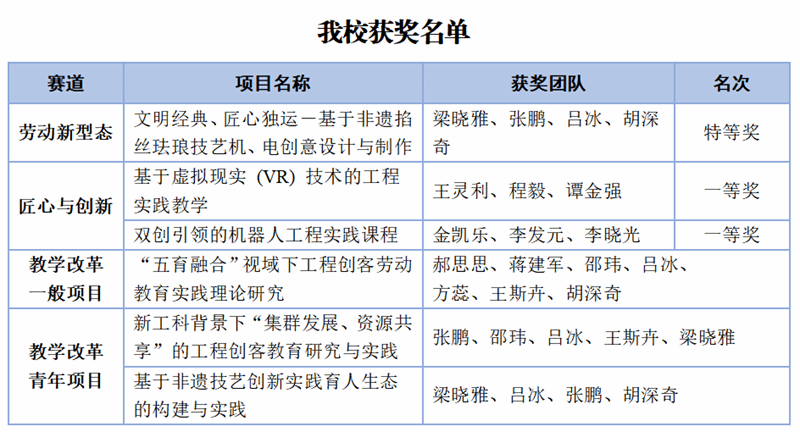 大赛共设置“匠心与创新”“劳动新形态”和“教学研究项目终评会”三个项目,经过前期全国六大赛区选拔,共有来自清华大学、浙江大学、哈尔滨工业大学等70余所高校的137支教师代表队入围决赛。经过激烈角逐,鸭脖官网“文明经典、匠心独运——基于非遗掐丝珐琅技艺机、电创意设计与制作”教学团队以“劳动新形态”赛项全国第一名成绩获得该项目特等奖,“基于虚拟现实 (VR) 技术的工程实践教学”团队和“双创引领的机器人工程实践课程”团队,分别获得“匠心与创新”赛项一等奖,三支团队分获教学研究青年项目和一般项目。