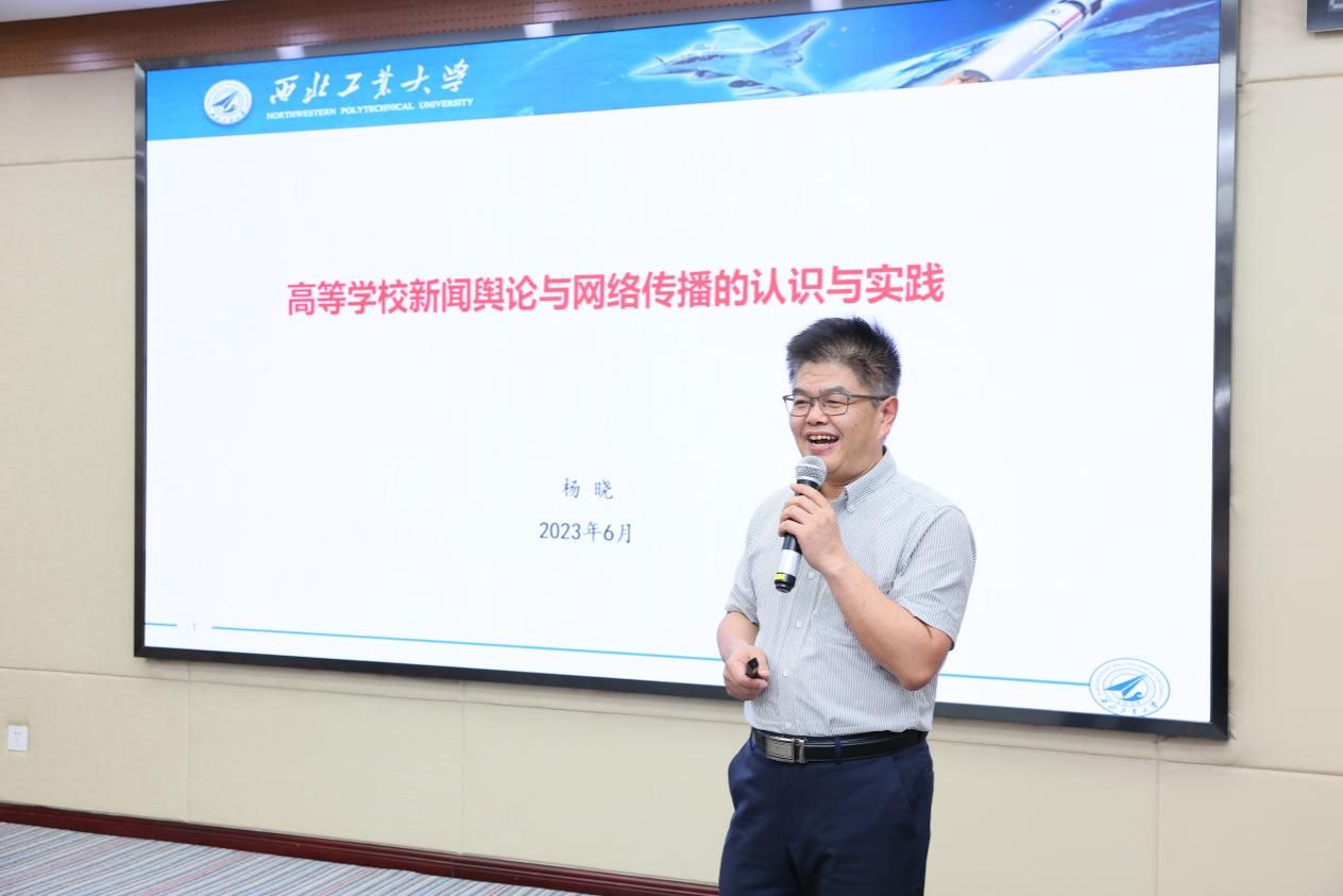 西工大新闻网6月16日电(文字 王庆摄影 卢迪 穆峥)6月15日下午,鸭脖官网召开校园新媒体工作座谈交流会。校党委副书记兼党委宣传部部长杨晓出席会议并讲授专题党课,学校办公室副主任宗凡,出版社总编辑、副社长雷军,党委宣传部副部长马西平及2022年度校园新媒体工作先进单位代表、先进个人共计50余人参会。会议由马西平主持。