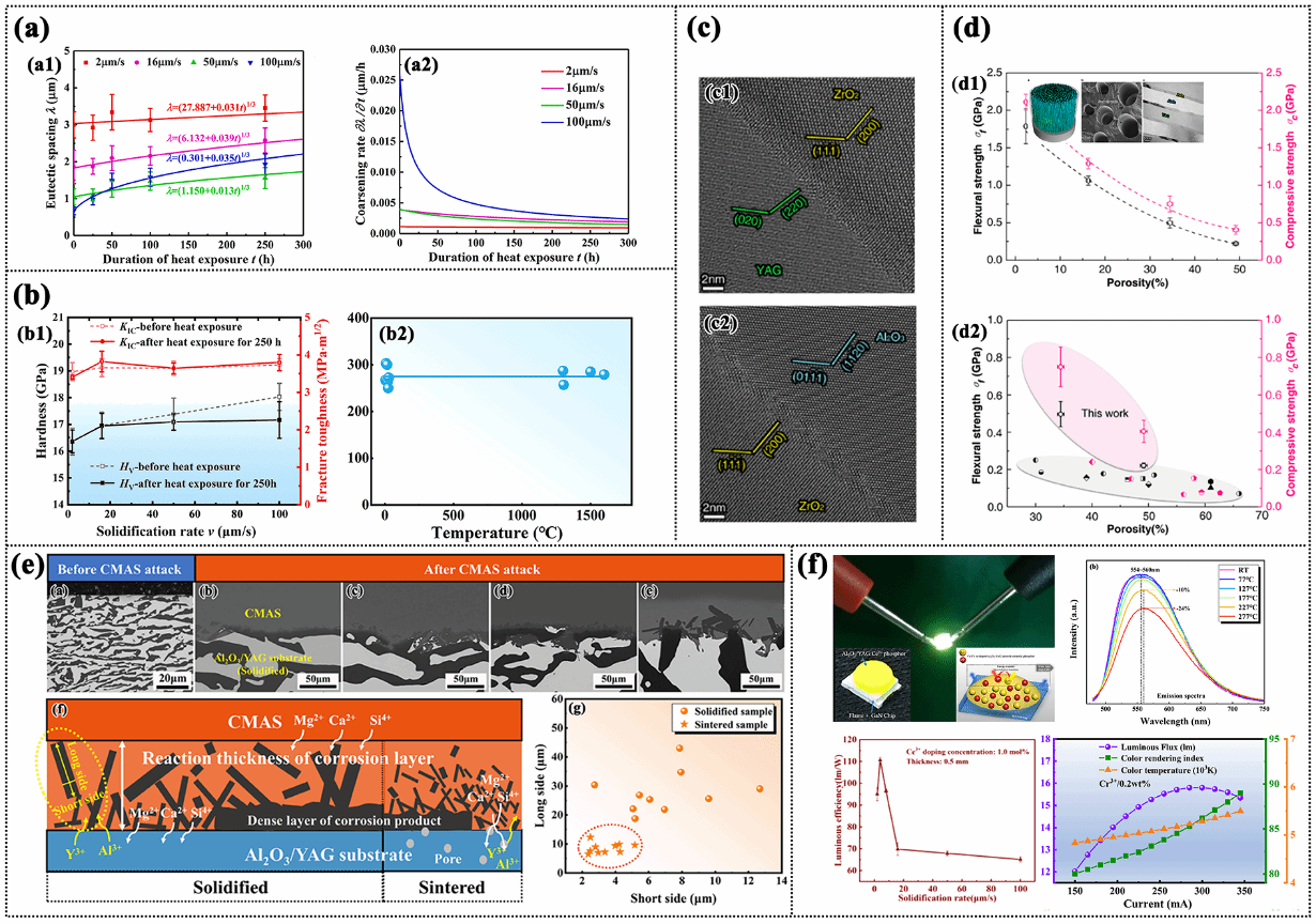 图3(a)氧化物共晶陶瓷凝固组织粗化速率,(b)热暴露前后硬度、断裂韧性及室温到高温(1600oC)的抗弯强度、(c)共格/半共格强结合相界面,(d)不同孔隙率下多孔共晶陶瓷抗弯性能;(e)抗CMAS腐蚀性能,(f)荧光陶瓷的发光性能