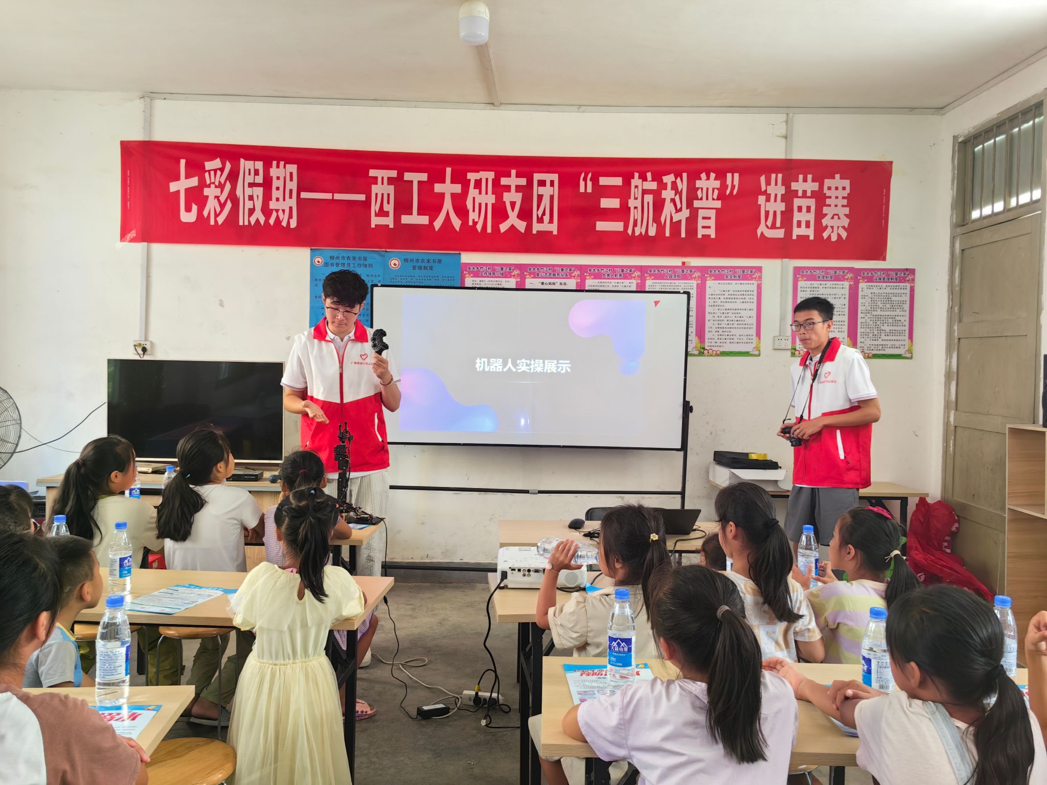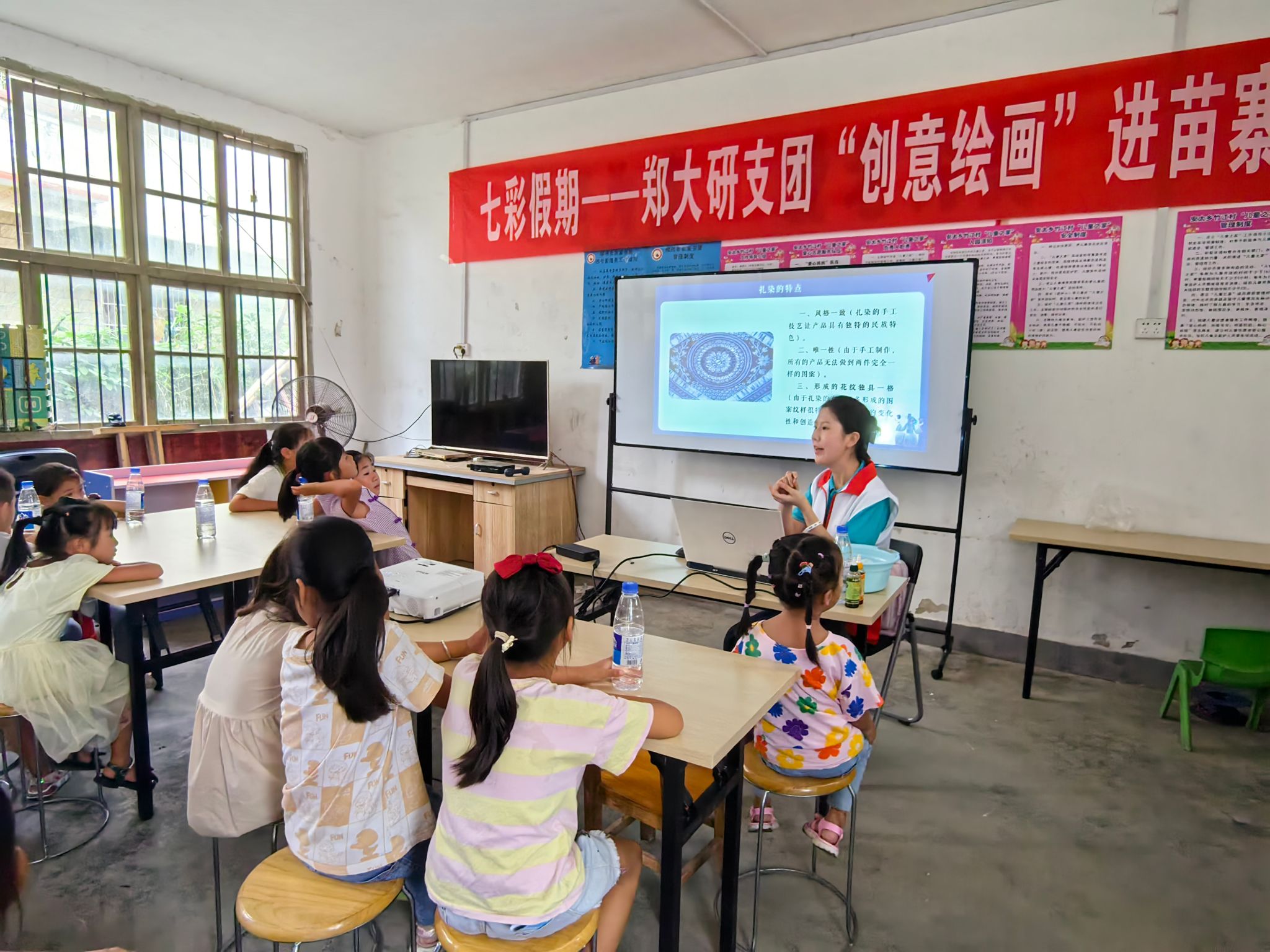 时值暴雨多发季节及溺水事故高发期,团县委工作人员首先围绕“六个不准”要求对小朋友进行了防溺水专题宣讲。西北工业大学研究生支教团以“航空、航天、航海”科普教育为主题,向孩子们讲述了“西工大的飞机”“智能机器人”等发展历史及工作原理。郑州大学研究生支教团以“创意绘画”为主题,向孩子们传授扎染艺术文化及传统工艺制作。