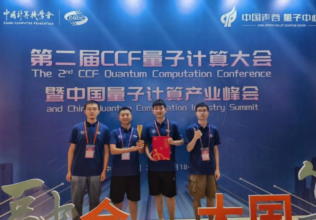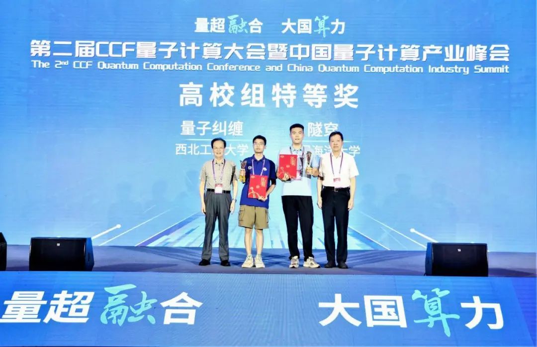 西工大新闻网9月16日电(潘炜 张伟伟 王翠萍)近日,由中国计算机学会CCF主办的第二届CCF量子计算大会暨中国量子计算产业峰会在安徽省合肥市召开,第二届CCF“司南杯”量子计算编程挑战赛颁奖典礼同期举行。西北工业大学计算机学院张伟伟副教授指导的本科生参赛队伍“量子纠缠”队获特等奖,队员为计算机学院2020级本科生夏卓、许安杰、陈柯帆以及微电子学院2021级本科生韩笑同学。同时,由张伟伟老师指导的计算机学院2020级本科生黄晓鹏同学单独参赛的项目《特定酉矩阵量子线路分解方案》获得优胜奖。