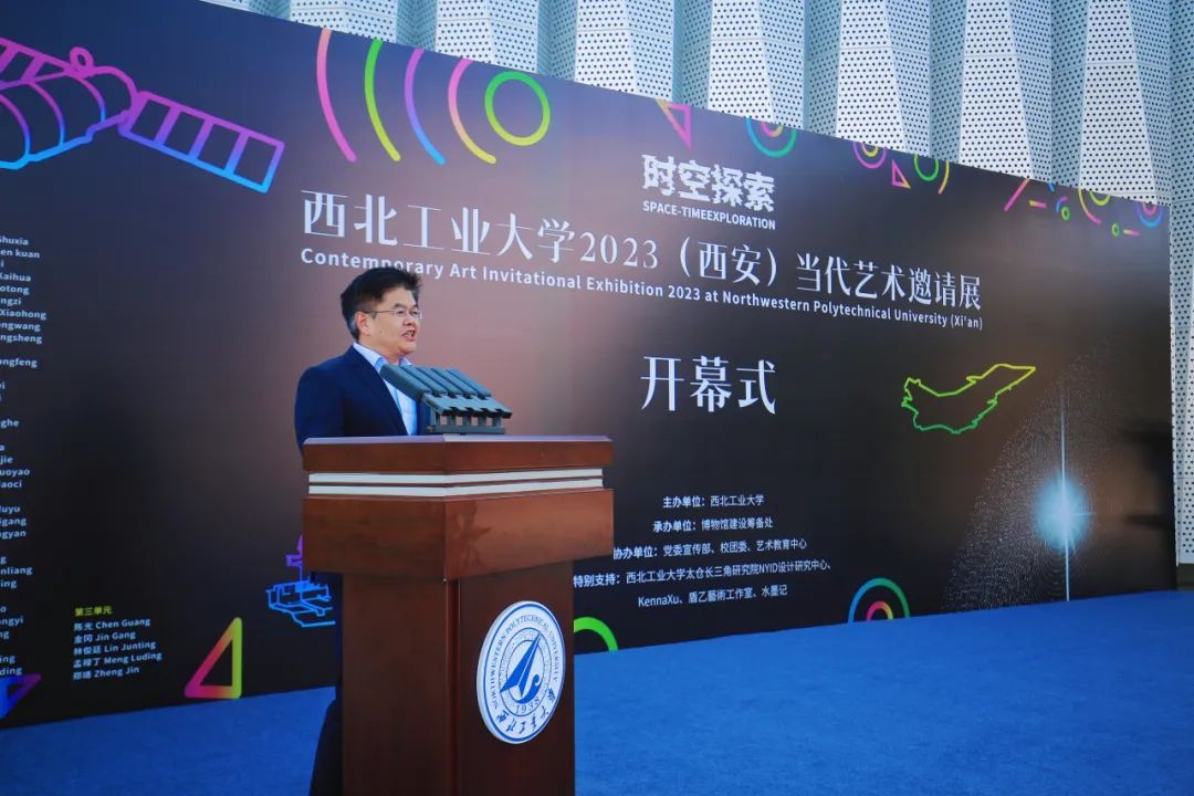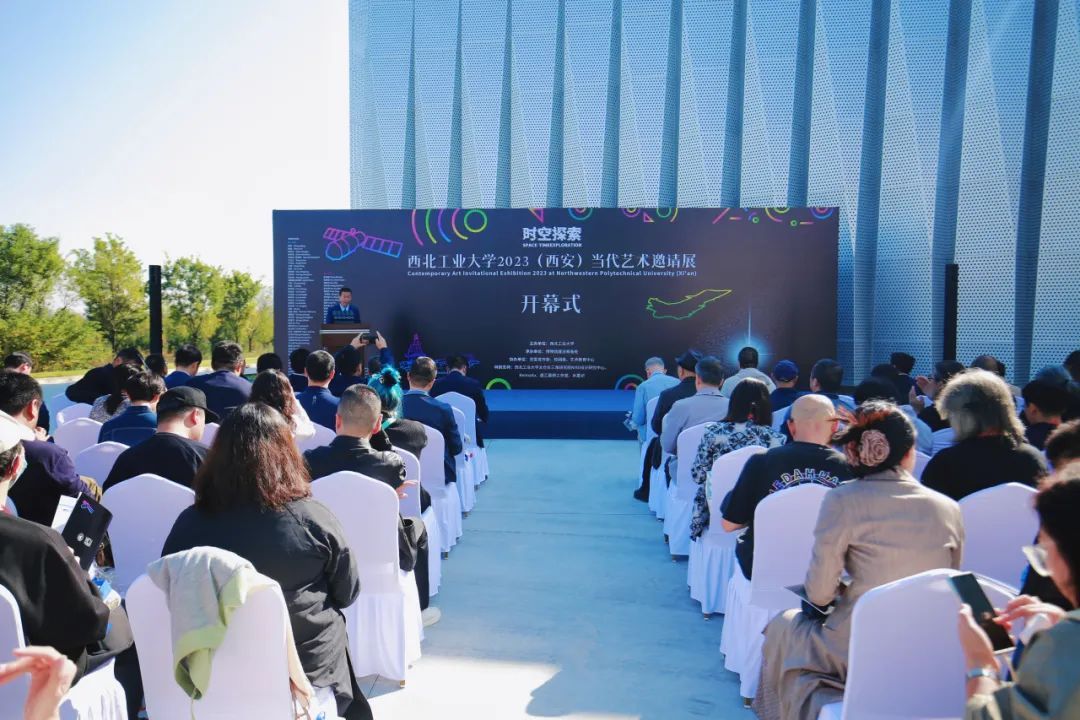 15日,“时空探索——西北工业大学2023(西安)当代艺术邀请展”开幕仪式在军工素质教育实践中心(博物馆)举行。校党委副书记、党委宣传部部长杨晓与120余位校友、嘉宾出席开幕仪式。