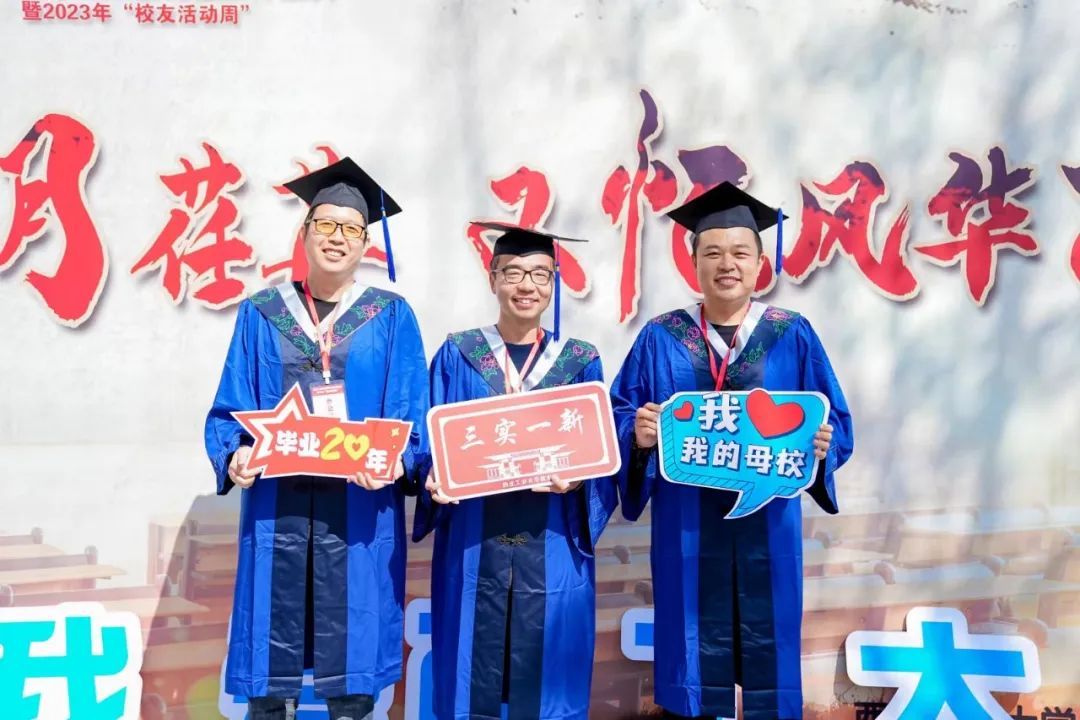 学校在各个地标处放置了多个背景墙和手持牌供校友拍照打卡。另外,还贴心地准备了不同时期的学位服,穿上学位服校友们还是当年那个壮志凌云、意气风发的少年。
