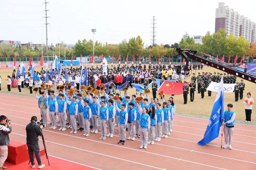 庄严护卫着国旗、校旗和奥林匹克会旗进入会场