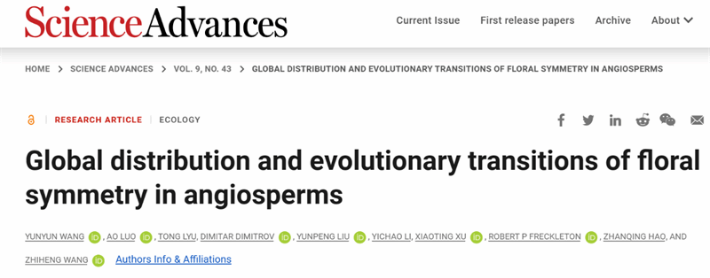 2023年10月25日,Science Advances期刊以“Global distribution and evolutionary transitions of floral symmetry in angiosperms”为题,发表了西北工业大学生态环境学院王芸芸副教授与北京大学城市与环境学院王志恒教授团队关于被子植物花对称性的时空格局及其对气候变化的响应的最新研究成果。