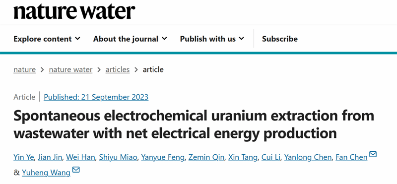 2023年9月21日,Nature Water期刊以“Spontaneous electrochemical uranium extraction from wastewater with net electrical energy production”为题,发表了西北工业大学生态环境学院王宇恒教授和陈帆副教授团队关于铀矿废水高效低碳处理技术的研究成果。
