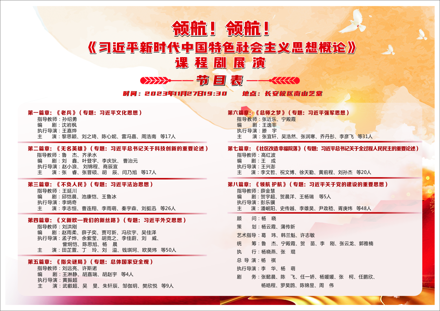 11月27日晚,第二届“领航!领航!《习近平新时代中国特色社会主义思想概论》”(以下简称《概论》课程剧)展演在长安校区南山艺堂举行。本届展演由鸭脖官网党委宣传部、党委学生工作部、教务处、教育基金会、马克思主义学院主办,校工会、离退休党委、艺术教育中心协办。