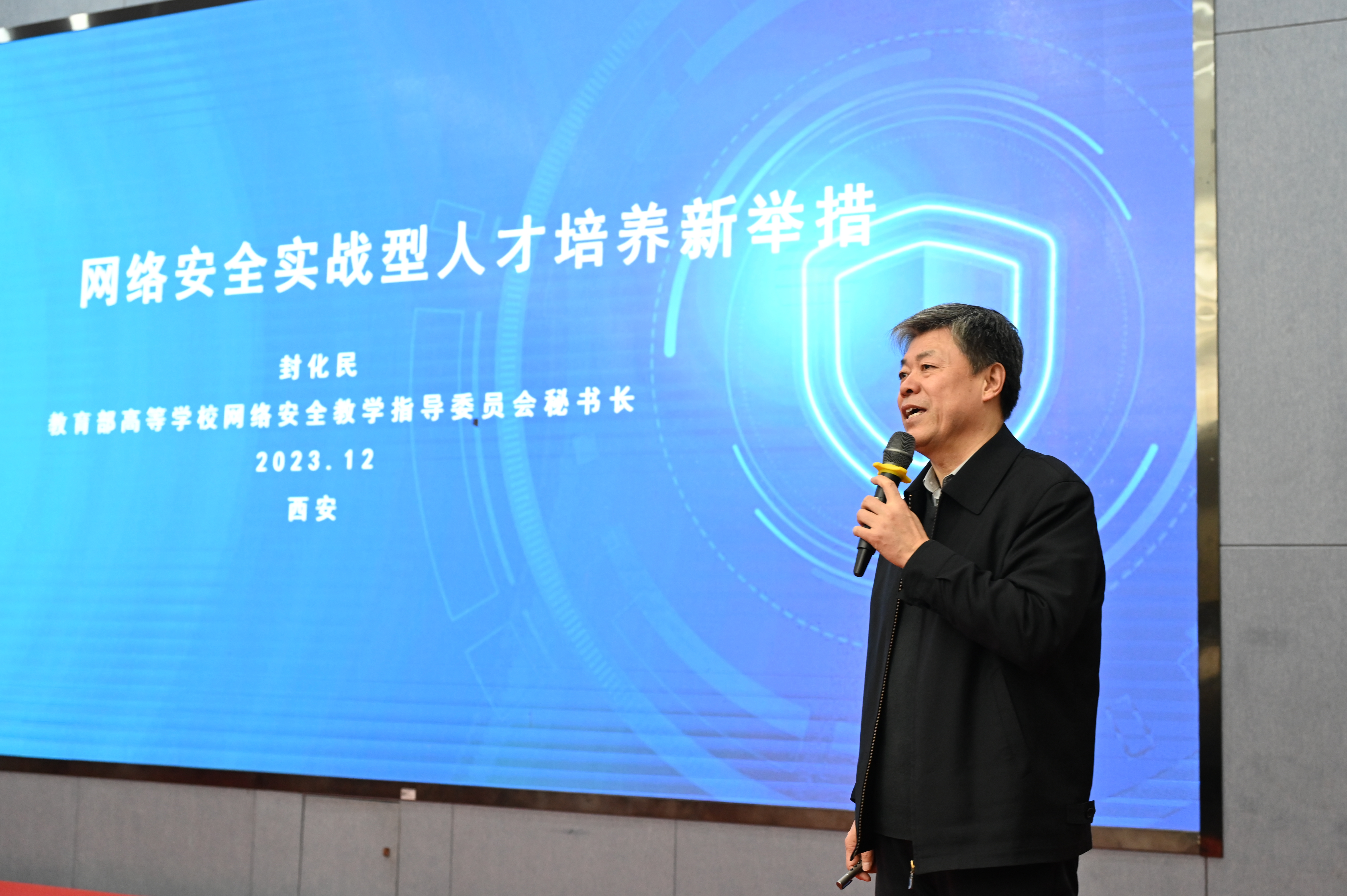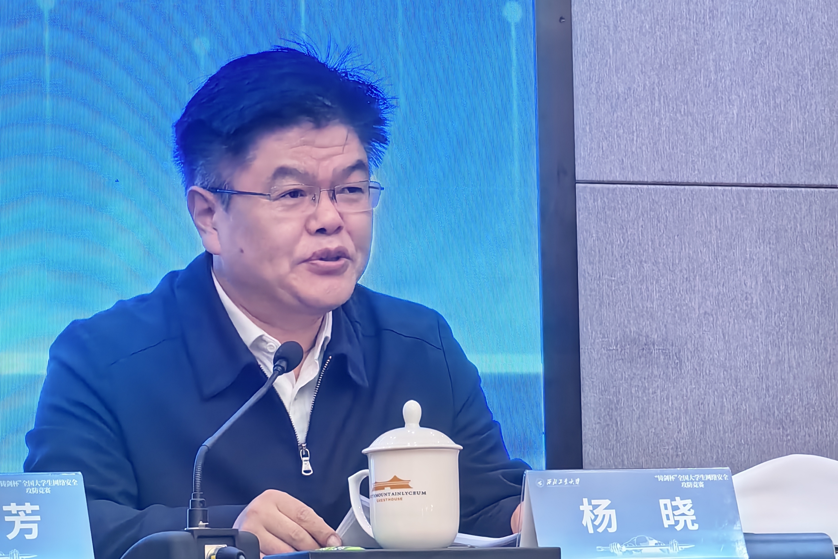 杨晓表示,西北工业大学高度重视网络安全人才培养工作。他指出,我们培养的网安领域的人才,是同时具备专业技能和创新思维的人才。通过本次竞赛培育实战型核心网络人才,在网络攻防实战中增强学生为国铸剑的奋斗意识和斗争精神,为培养优秀网安人才奠定基础。他鼓励同学们要认真学习贯彻习近平总书记关于网络安全的重要论述,同时进一步提升网络安全技能,增强创新意识和团队合作意识,提升网络安全素养。最后预祝本次“铸剑杯”全国大学生网络安全攻防竞赛圆满成功,也祝愿所有参赛的同学们能够展现良好的竞技状态,赛出风貌,赛出水平,取得优异成绩。