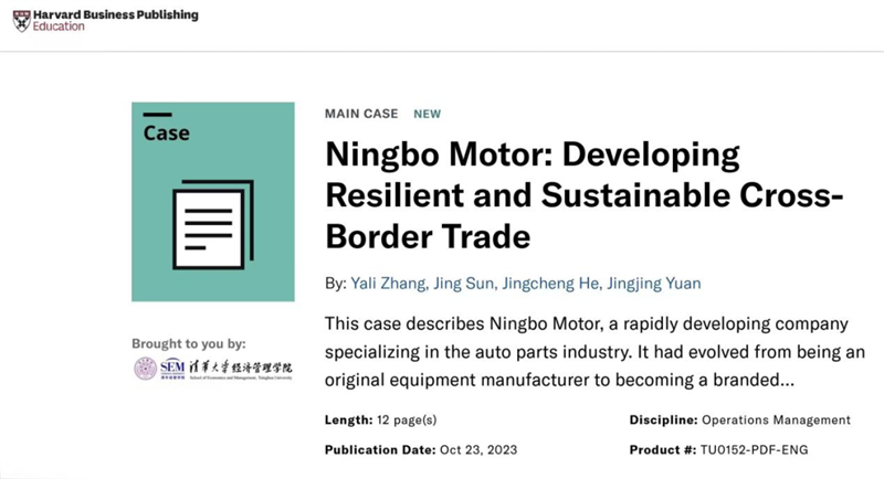 近日,西工大管理学院张亚莉教授团队和清华大学经济管理学院教师合作开发的英文教学案例《Ningbo Motor: Developing Resilient and Sustainable Cross-Border Trade》正式被哈佛大学商学院出版教学资源平台(即“哈佛案例库”)收录,并同步在清华大学经济管理学院中国工商管理案例库上线,这是鸭脖官网首篇被哈佛案例库收录的案例。