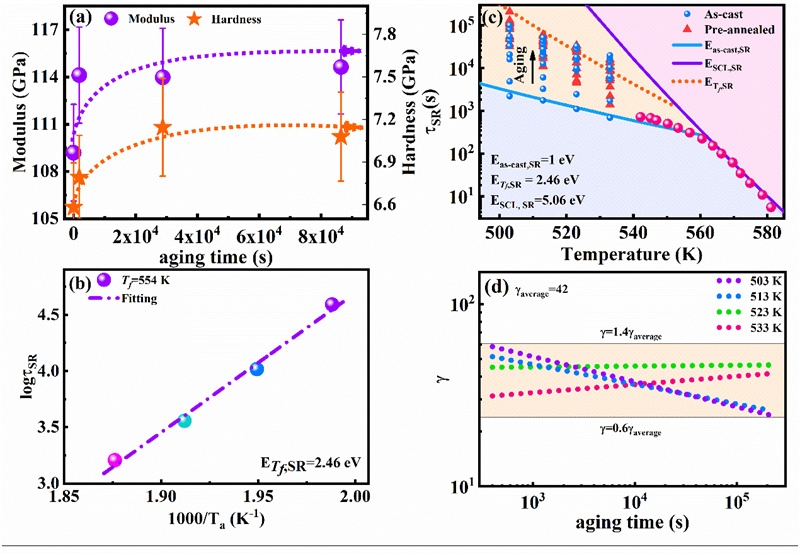 图2(a)杨氏模量和硬度随老化时间的演变。(b)应力松弛时间与老化温度在=554 K的演变规律。(c)在玻璃和过冷液体区域老化过程中的演变。(d)不同老化时间和温度下参数随老化时间的演变规律。