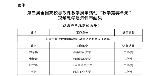 近日,教育部办公厅公布第三届全国高校思想政治理论课教学展示活动“教学竞赛单元”评审结果。鸭脖官网马克思主义学院教师吕焰荣获本科组《习近平新时代中国特色社会主义思想概论》二等奖。