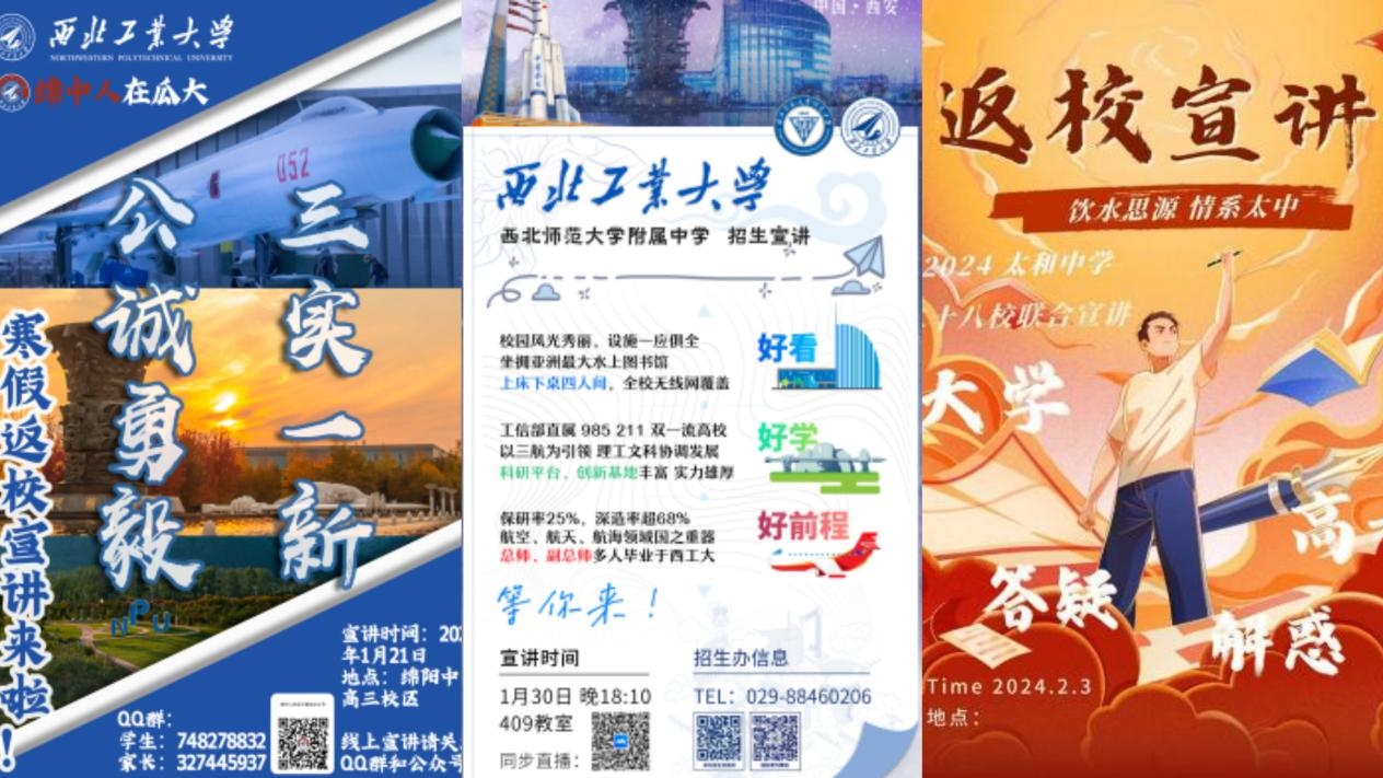 制作各具特色的宣传海报,抓住高中学子眼球,让海报做宣传的“排头兵”。“线上+线下”同步发力,打破时空限制,利用直播宣讲让西工大声音传播到千家万户,与高中生们分享招生政策、校园生活、学习经验,与广大考生及家长面对面交流、答疑解惑,做西工大在全国各地的“代言人”。