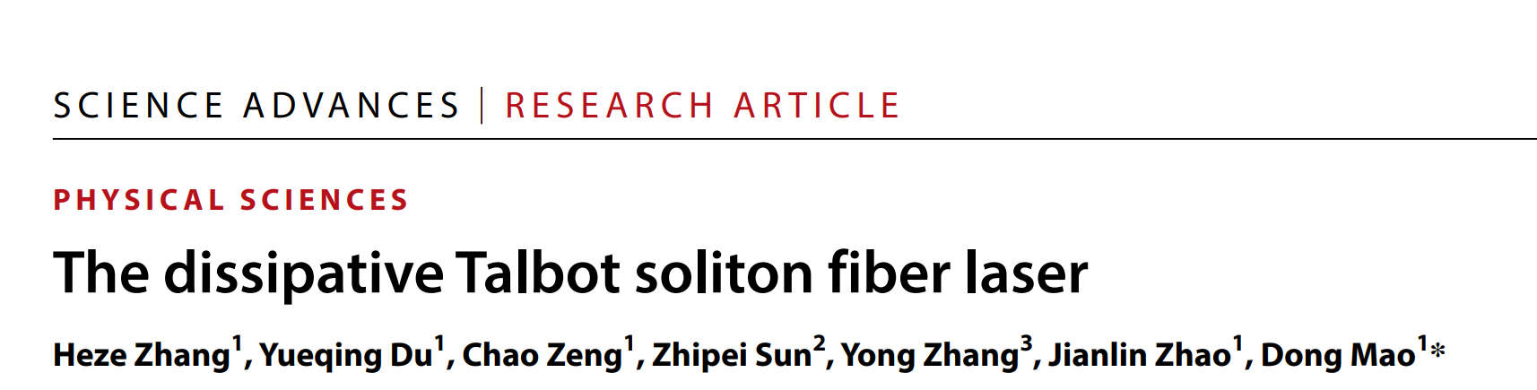 近日,西北工业大学毛东教授、赵建林教授团队与南京大学张勇教授以及芬兰阿尔托大学孙志培教授合作在塔尔博特孤子锁模激光方面取得重要进展。研究成果以“The dissipative Talbot soliton fiber laser”为题发表在国际顶级学术期刊《Science Advances》(《Science》期刊的子刊)上,同时入选该期的特色图 (Featured image)。论文第一作者为在读博士研究生张何泽,通讯作者为毛东教授。论文链接:https://www.science.org/doi/10.1126/sciadv.adl2125
