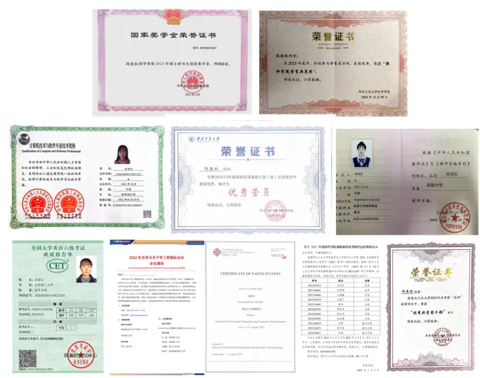 冯亚红着力全面发展,通过赴香港理工大学交流学习,深化了专业能力并大幅提升领导与创新能力;她践行身心并重原则,积极参与体育运动并在2023陕西大学生迷你马拉松联赛中以出色体能与坚韧毅力展现出个人最佳状态。通过研学实践和体育运动的双重锤炼,冯亚红显著提升了自身的综合素质和自我管理能力。