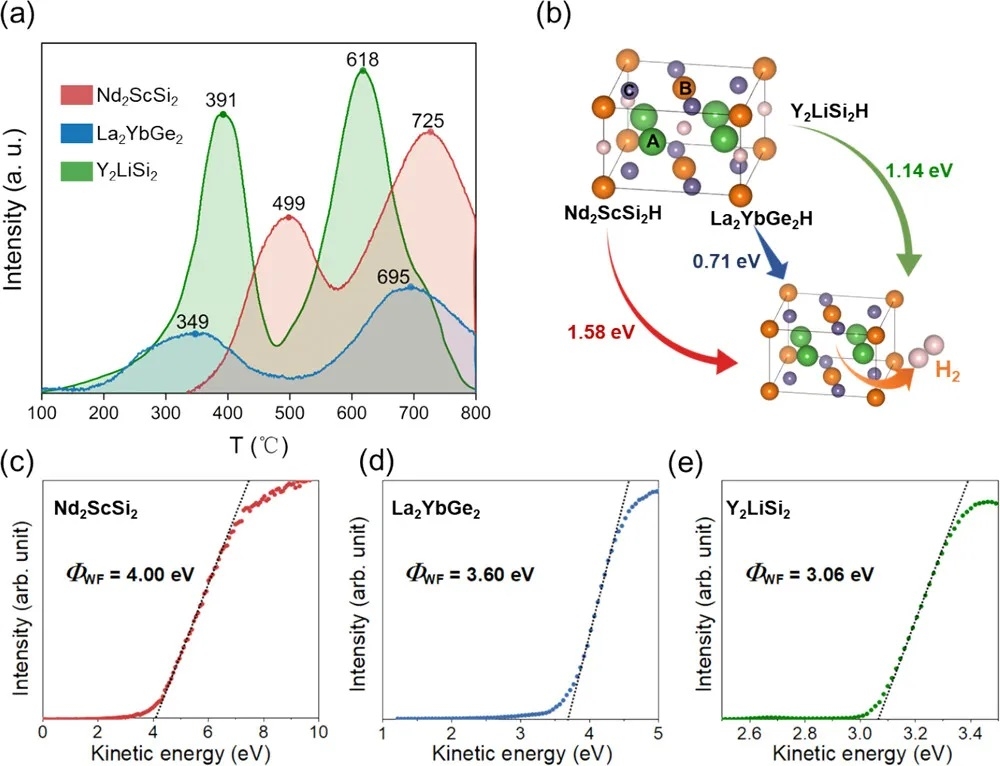 图6. 氢储存性能和功函数:(a)TPD谱图;(b)计算得到的氢脱出能量变化;(c-e)通UPS测试的功函数