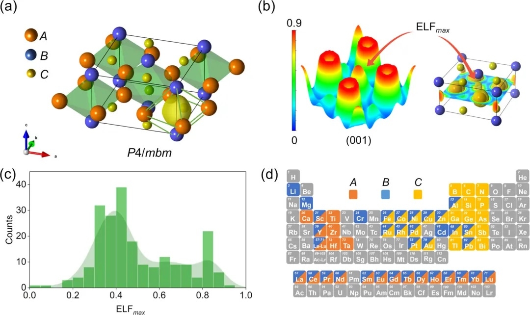 图2. 数据集构建:(a)A2BC2结构示例(Yb2MgP2)及其ELF;(b)ELFmax示意图;(c)214种现有A2BC2化合物的ELFmax分布;(d)预测数据集所涉及的元素