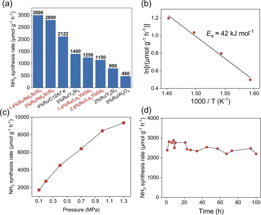 图7. 富电子型A2BC2电子化合物的合成氨性能评估:(a)在400°C和0.1 MPa条件下催化剂的活性比较;(b)Ru/Nd2ScSi2的表观活化能测试;(c)3%Ru/Nd2ScSi2在不同压力下的活性测试;(d)3%Ru/Nd2ScSi2的活性稳定性测试