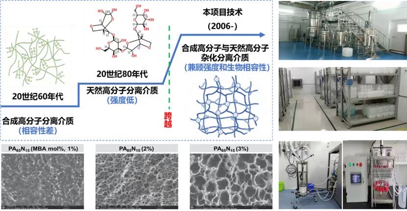 该成果围绕生物活性物质高效分离检测用材料的设计、制备、应用等方面的基础科学问题开展了13年系统研究,设计并制备了多机制协同增强水凝胶层析材料,提出了溶剂缓慢置换的致孔方法,发展了分离材料孔道和骨架结构控制理论和方法等9项关键技术,建成了年产5万升的生产线。成果在蛋白分离、疫苗纯化、抗体药物制备及核酸检测等领域获得推广应用,整体技术达到国际先进水平,打破了国外垄断,极大提高了我国生物药产业的自主开发能力,经济和社会效益巨大。