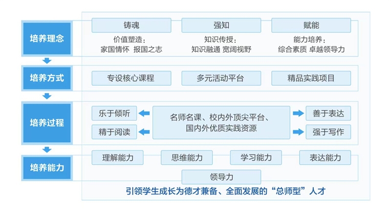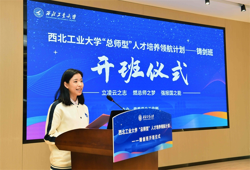 西北工业大学“总师型”人才培养领航计划——铸剑班是推进“总师型”人才培养的重要改革举措,立足第二课堂,选拔一批有优秀发展潜质的学生,把“总师育人文化”融入培养全过程,开展拔尖培养,重点培养学生的家国情怀、科学家精神、创新能力、综合素质及领导力,促进学生加速成长为“总师型”人才。具体将围绕“乐于倾听、善于表达、精于阅读、强于写作”四翼赋能构建综合素质及领导力优质培养环节,努力造就以“总师型”人才为代表的堪当民族复兴重任的时代新人。