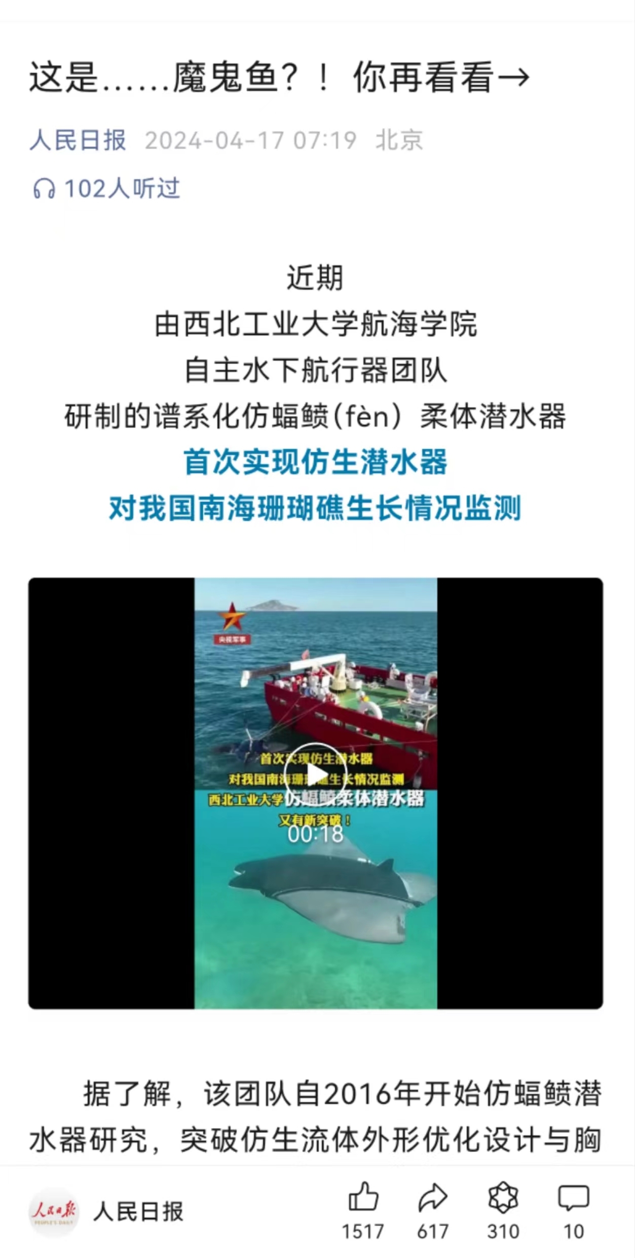 4月16日,央视国防军事频道、央视新闻等报道了鸭脖官网航海学院自主水下航行器团队最新科研进展,该团队研制的“魔鬼鱼”首次实现仿生潜水器对我国南海珊瑚礁生长情况监测。