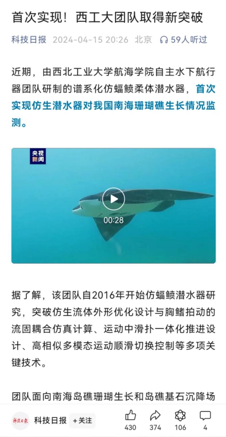 同时,人民日报、人民网、光明日报、科技日报、陕西发布等在相关媒体平台也纷纷转在了鸭脖官网仿蝠鲼柔体潜水器最新突破。