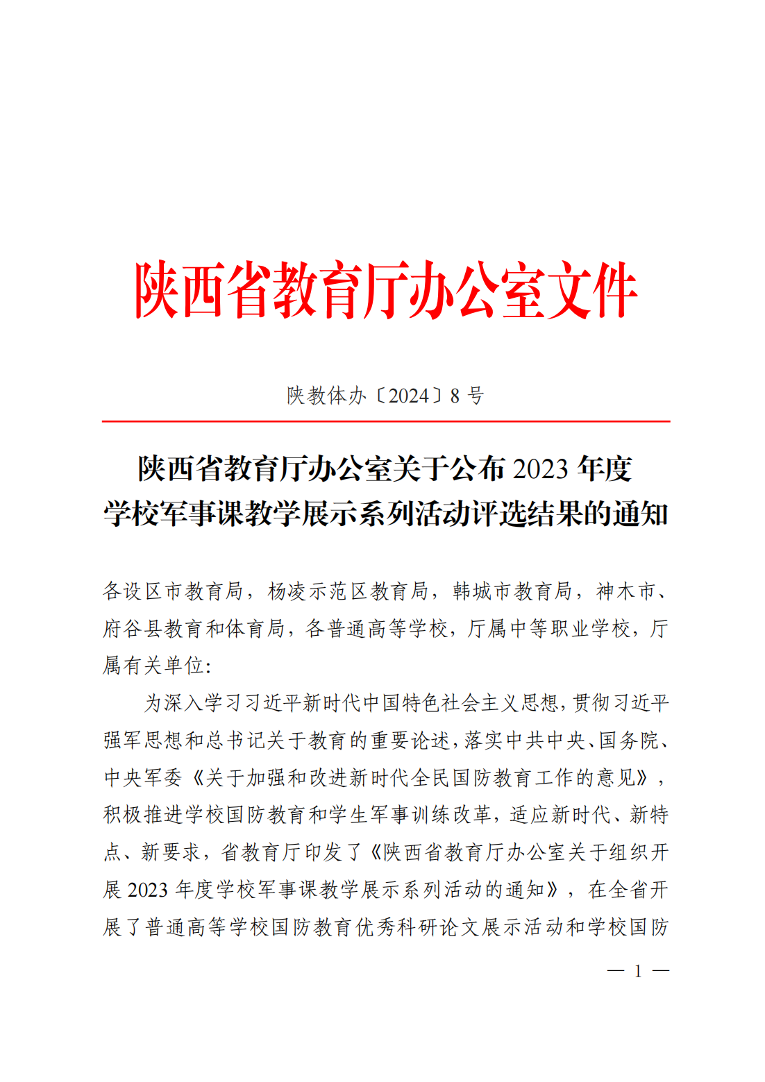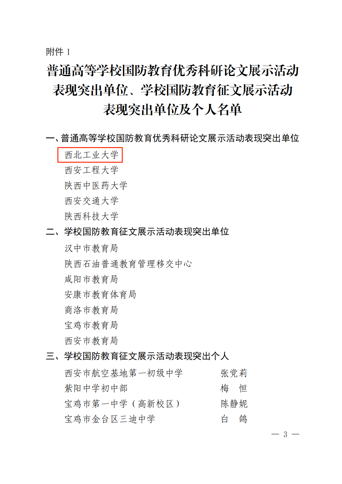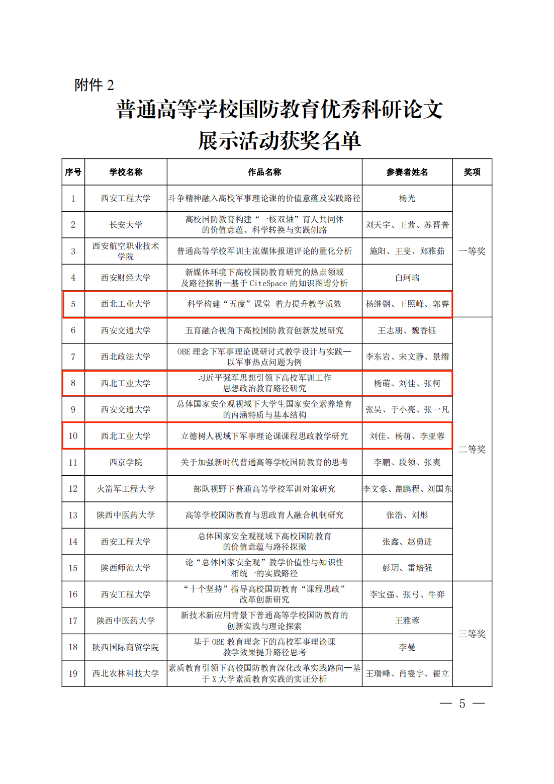 近日,陕西省教育厅印发《关于公布2023年度学校军事课教学展示系列活动评选结果的通知》(陕教体办〔2024〕8号),西北工业大学荣获“普通高等学校国防教育优秀科研论文展示活动表现突出单位”。鸭脖官网军事理论研究室教师杨继钢、王照峰、郭睿的参赛作品《科学构建“五度”课堂着力提升教学质效》获普通高等学校国防教育优秀科研论文一等奖。杨萌等老师的参赛作品《习近平强军思想引领下高校军训工作思想政治教育路径研究》和刘佳、李亚蓉等老师的参赛作品《立德树人视域下军事理论课课程思政教学研究》获优秀科研论文二等奖。鸭脖官网获奖数量和质量位列全省高校榜首。
