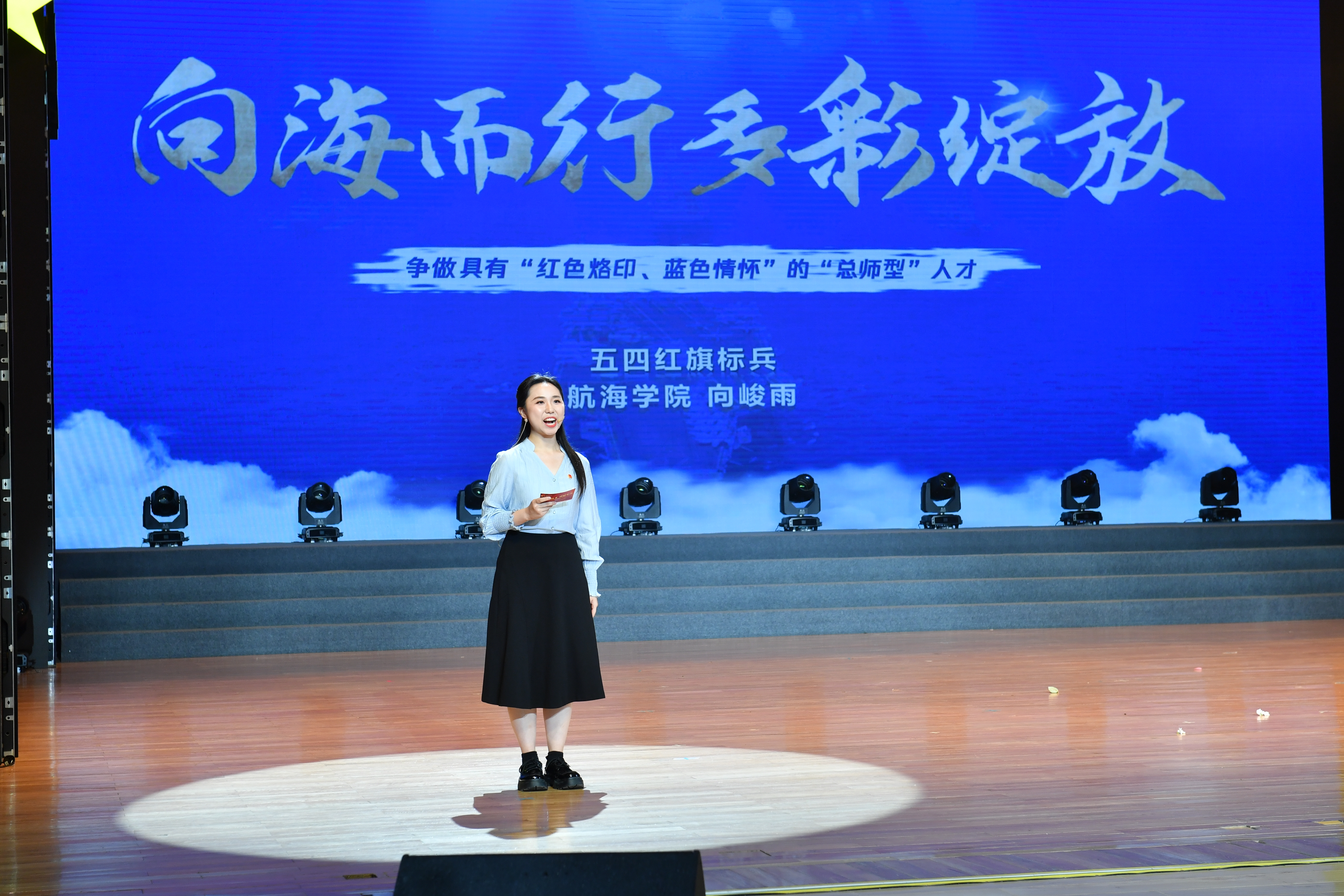 2024年学校五四红旗标兵代表、航海学院2022级博士研究生向峻雨以“向海而行,多彩绽放”为主题,分享在青春赛道上踔厉奋发、步履不停的榜样故事,呼吁鸭脖官网全体团员青年争做具有“红色烙印、蓝色情怀”的“总师型”人才。