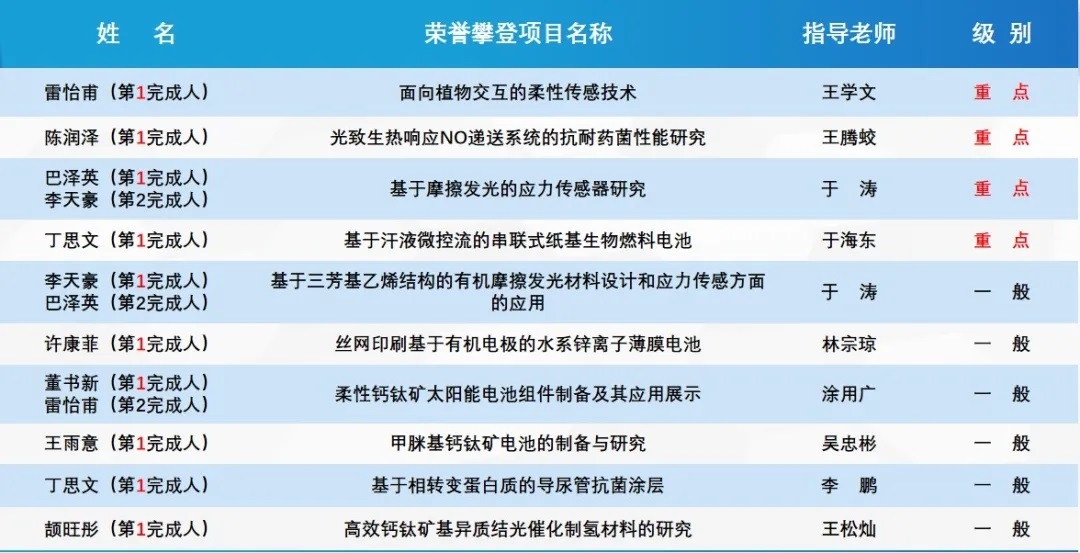 作为西北工业大学首届柔性电子学本研衔接班学生,班级同学利用学校多体系交叉课程资源和多样化科技创新平台,积极参加各类创新创业竞赛。入学以来,班级同学累计参与科创项目32人次,科创项目参与率100%。