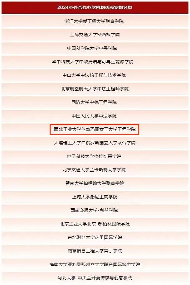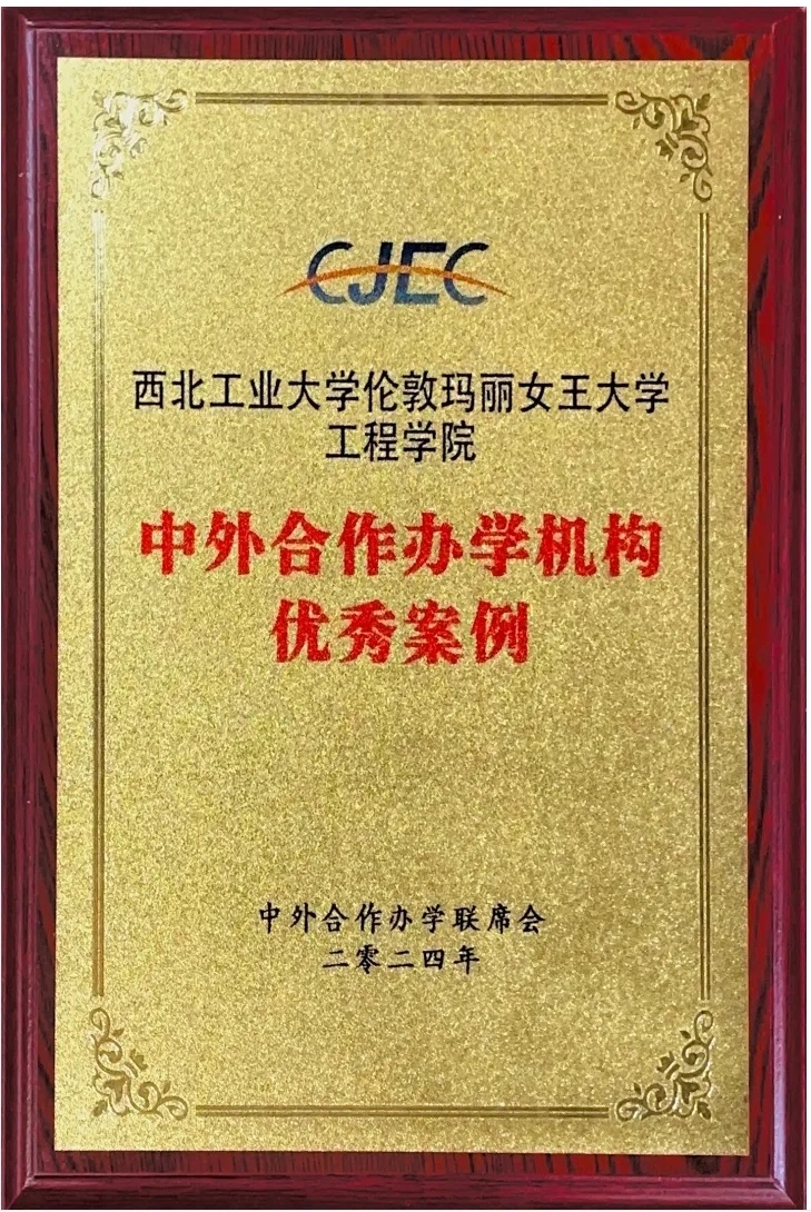 2024年5月18日,“中外合作办学联席会第三届主席单位会议”在上海召开,会上发布了优秀案例机构名单,20家中外合作办学机构获评优秀案例。西北工业大学伦敦玛丽女王大学工程学院凭借其在人才培养、国际合作和辐射引领等领域的杰出贡献和卓越表现,经过自愿申报、通讯评审、专家组现场评审三个阶段的角逐,荣获此次中外合作办学机构优秀案例。这一荣誉不仅是对玛丽女王工程学院过往工作的高度认可,更是对西工大全球合作的认可。