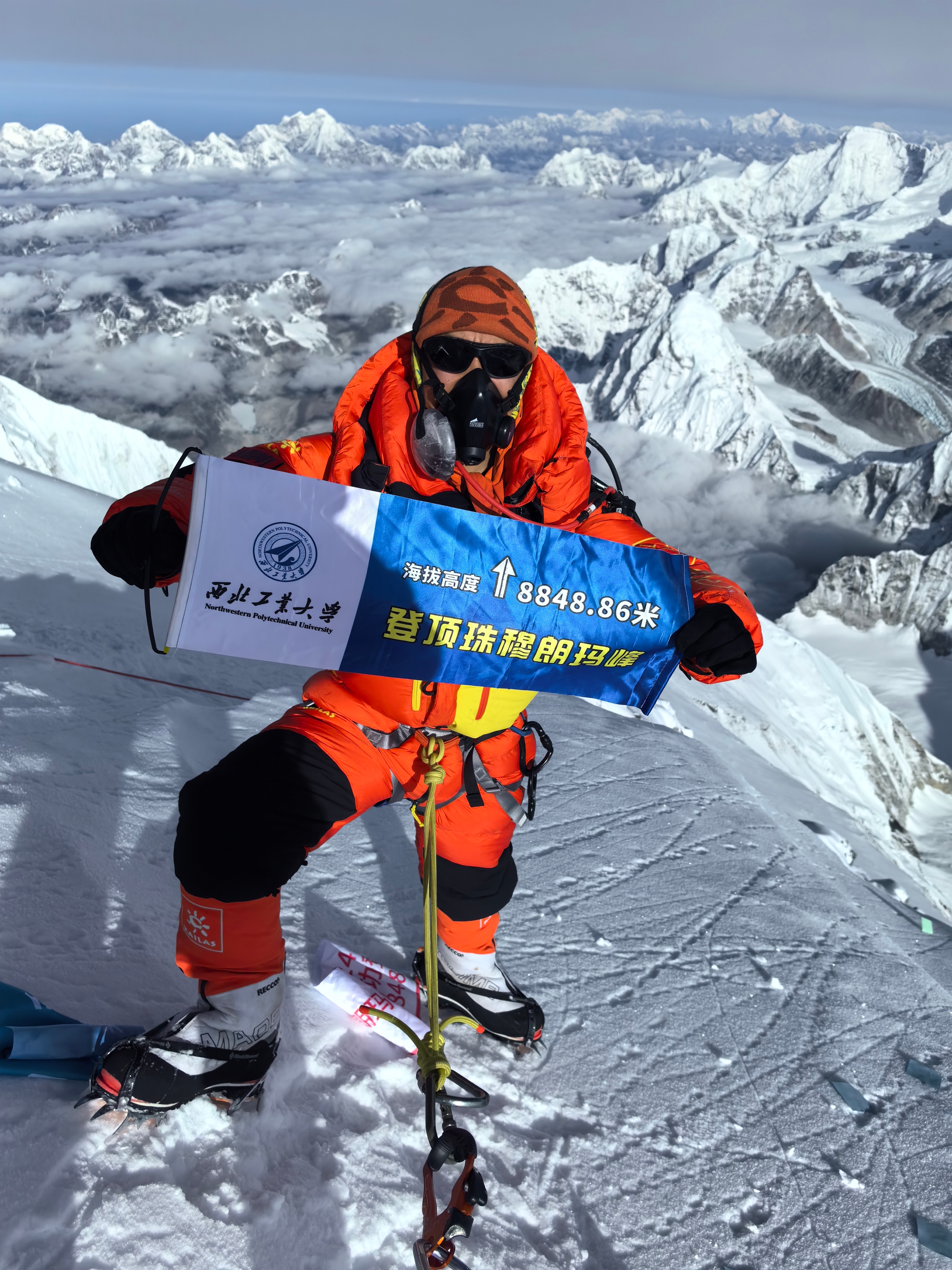 为登顶“珠峰”,从训练到攀登,历时40多天,余国明最终成功,在“世界之巅”,展开了西北工业大学的旗帜,向母校献上世界“最高”的祝福!